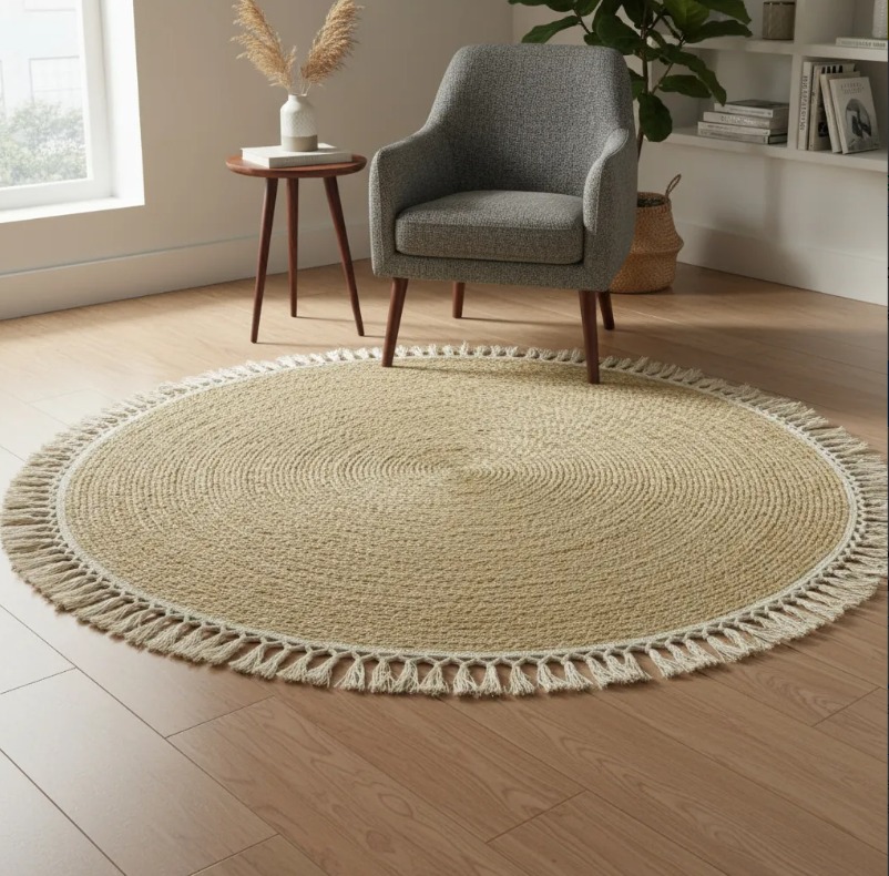 ALFOMBRA DE YUTE DISEÑO LISO TRADICIONAL CON FLECOS BLACOS, 120 CM DIAMETRO PRECIO OFERTA 🔥$34.990🔥