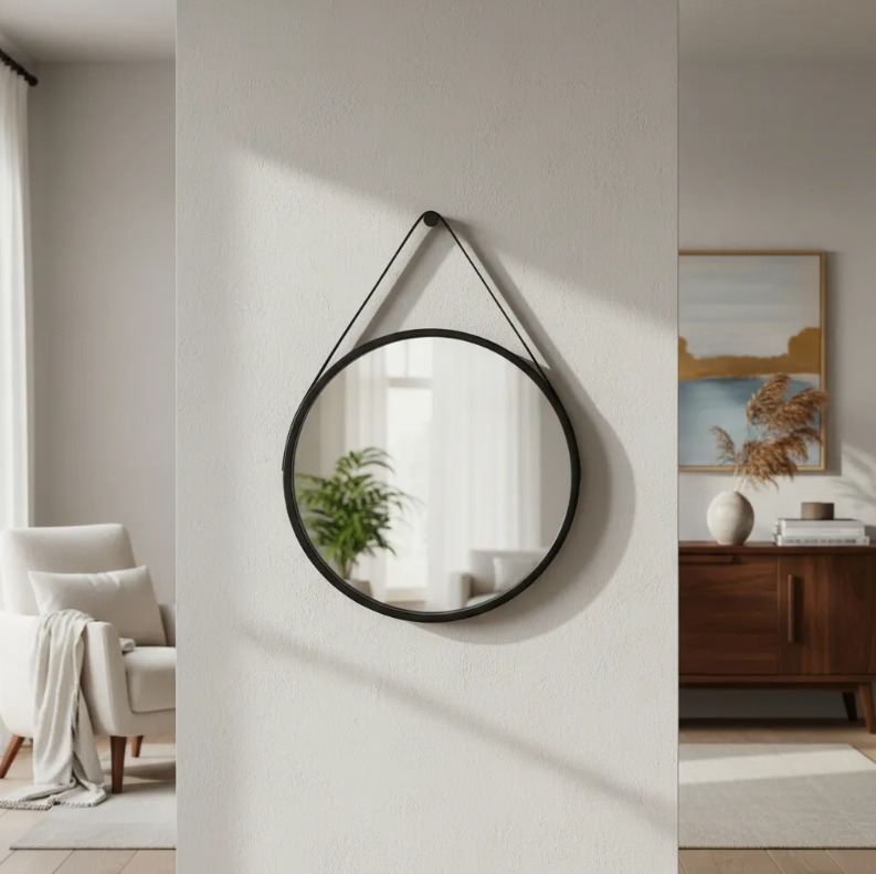 ESPEJO REDONDO COLORES NEGRO, DORADO Y BLANCO CORREA ECOCUERO. 52X52X5 CM 🔥🔥$26.990🔥🔥