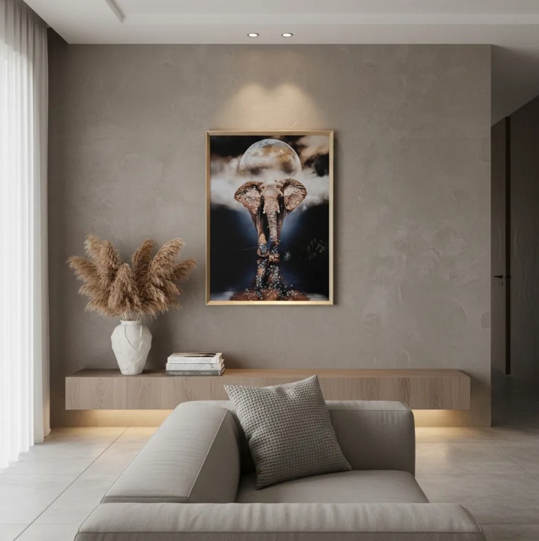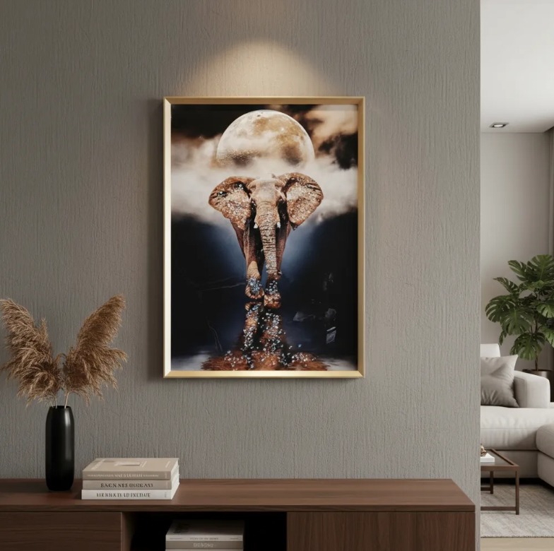 CUADRO ELEFANTE/LUNA, ESTILO PINTURA DIAMANTE 5D RELIEVES, MARCO DORADO. 81X61X3 CM, 🔥$32.990🔥