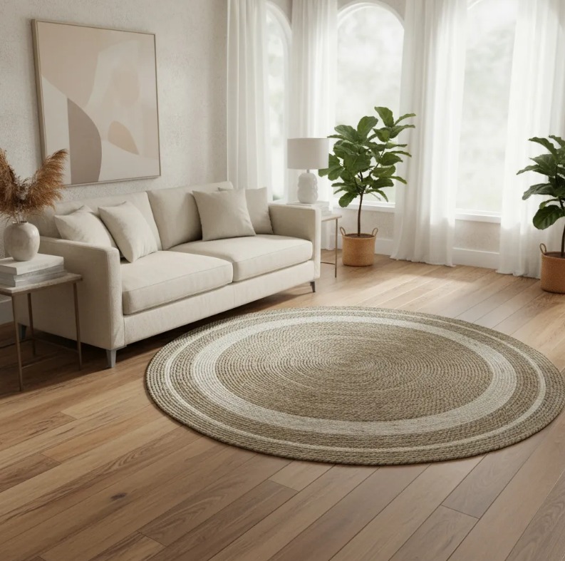HERMOSA ALFOMBRA DE YUTE DISEÑO CIRCULAR BICOLOR, 120 CM DIAMETRO PRECIO OFERTA 🔥$34.990🔥