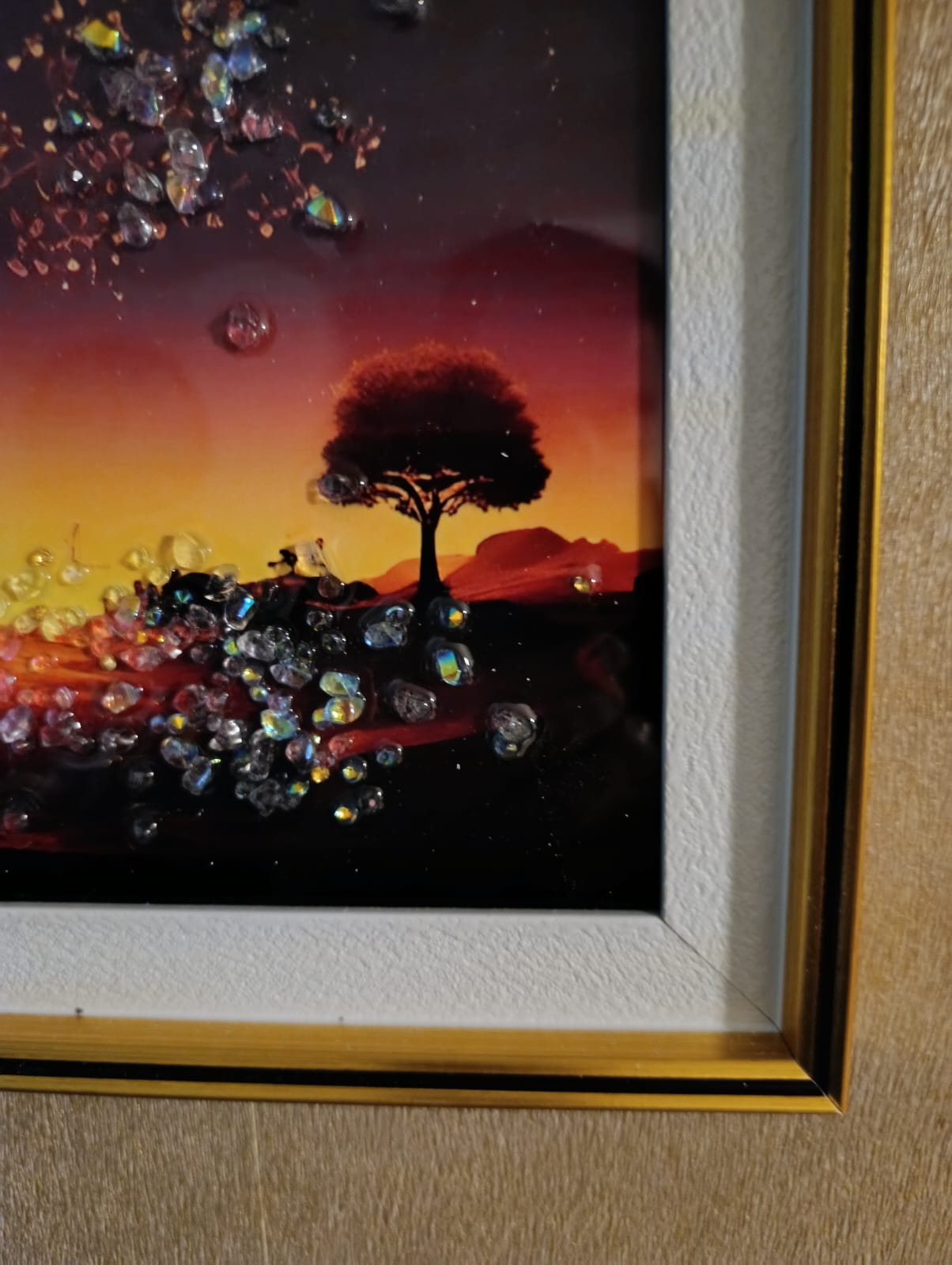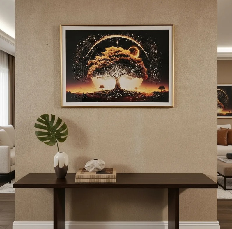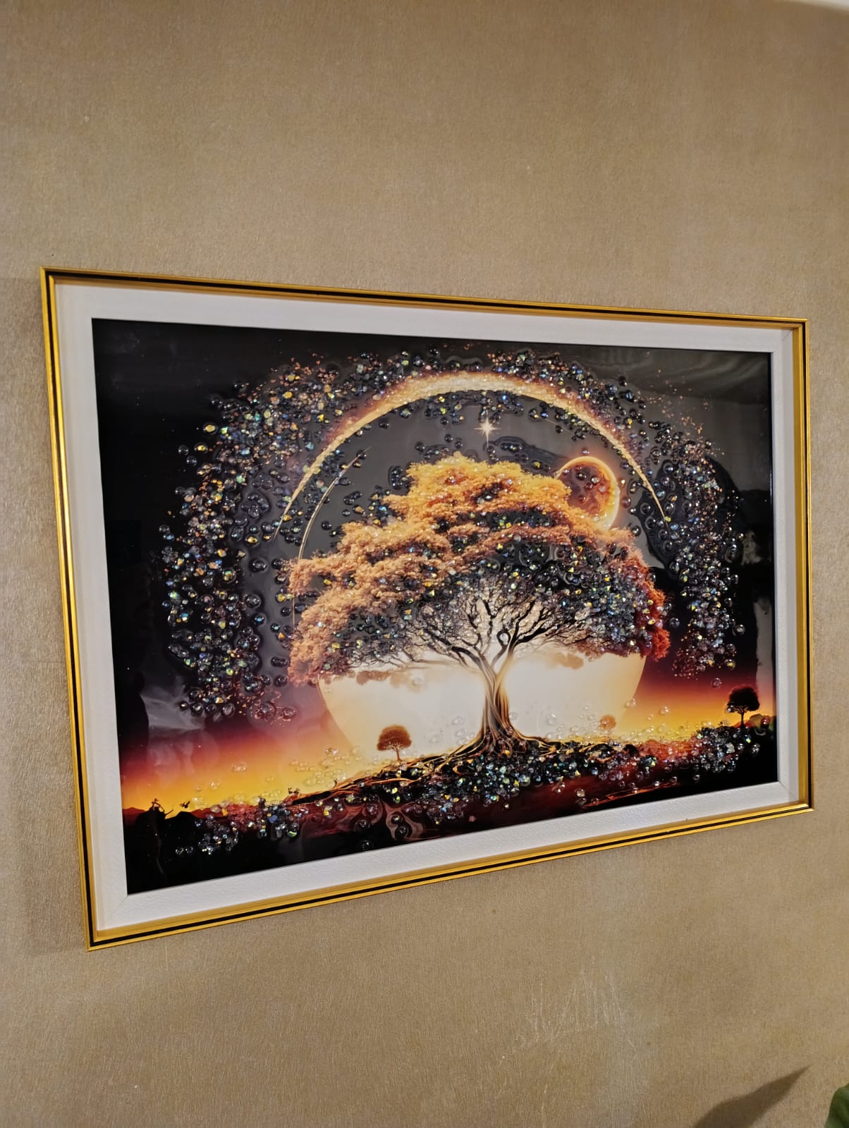 HERMOSO Y ELEGANTE CUADRO ARBOL DE DIAMANTE EN EL ATARDECER, ESTILO DE PINTURA DIAMANTE 5D RELIEVE, MARCO NEGRO, 71X51X3 CM, IDEAL PARA DECORAR DE FORMA ELEGENTE Y MODERNA CUALQUIER ESPACIO DE TU HOGAR.