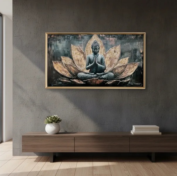 El material del marco, elaborado en PU, garantiza durabilidad y ligereza, facilitando su colocación en cualquier habitación. Ideal para salones, oficinas o espacios de meditación, este cuadro no solo embellece, sino que también promueve un ambiente armónico y relajado.