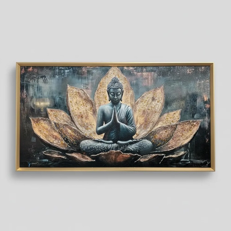 Transforma tu espacio con el Cuadro Buda Flor Loto, una pieza artística de impacto que combina belleza y serenidad. Su impresionante tamaño de 60 cm de altura por 110 cm de ancho, junto con un marco dorado de 3 cm de espesor, lo convierten en el centro de atención perfecto para cualquier pared.