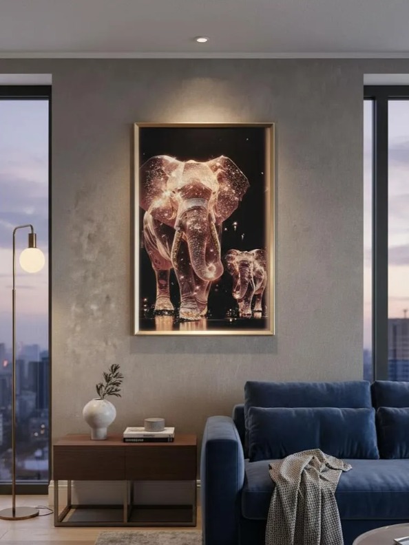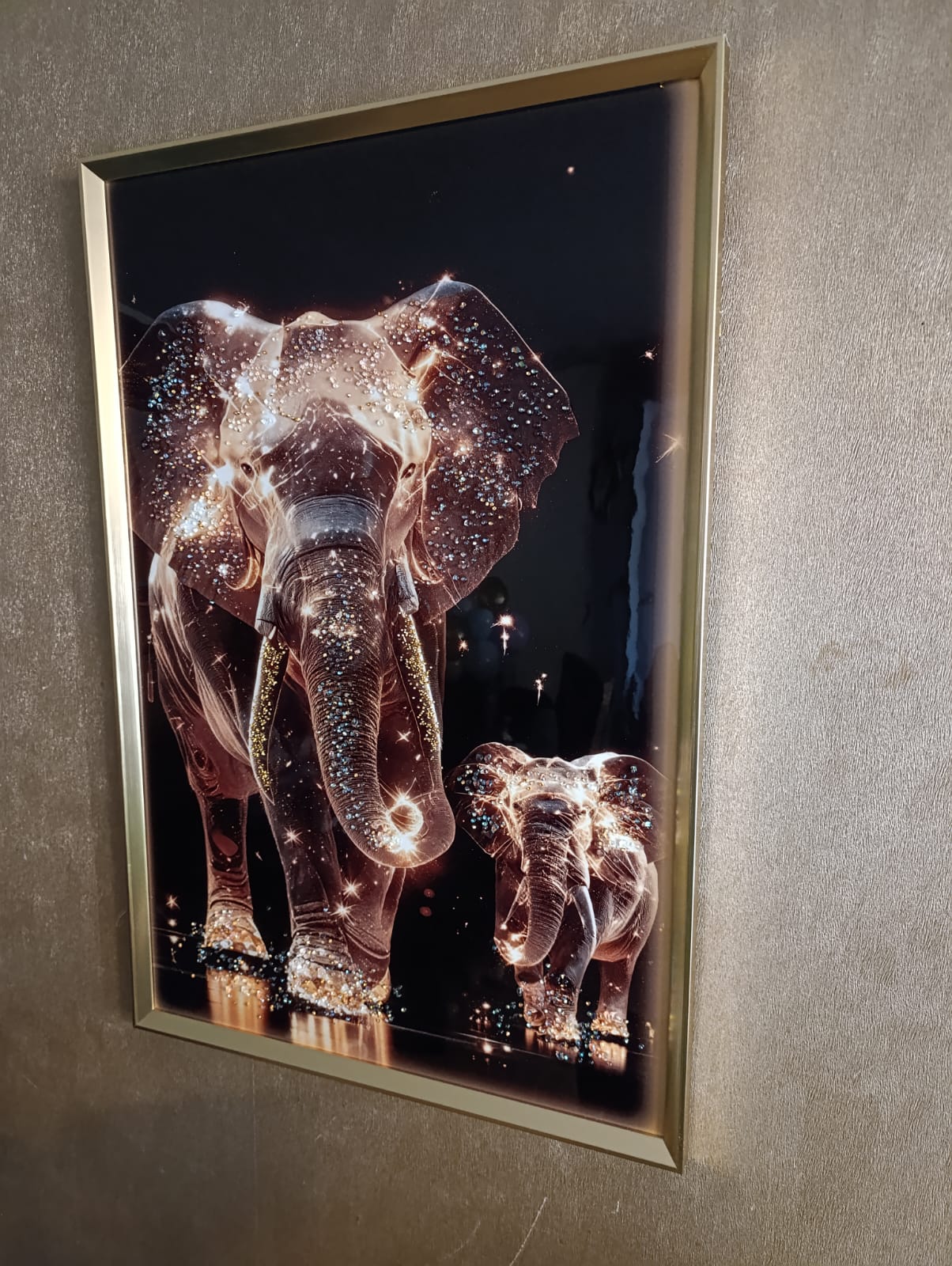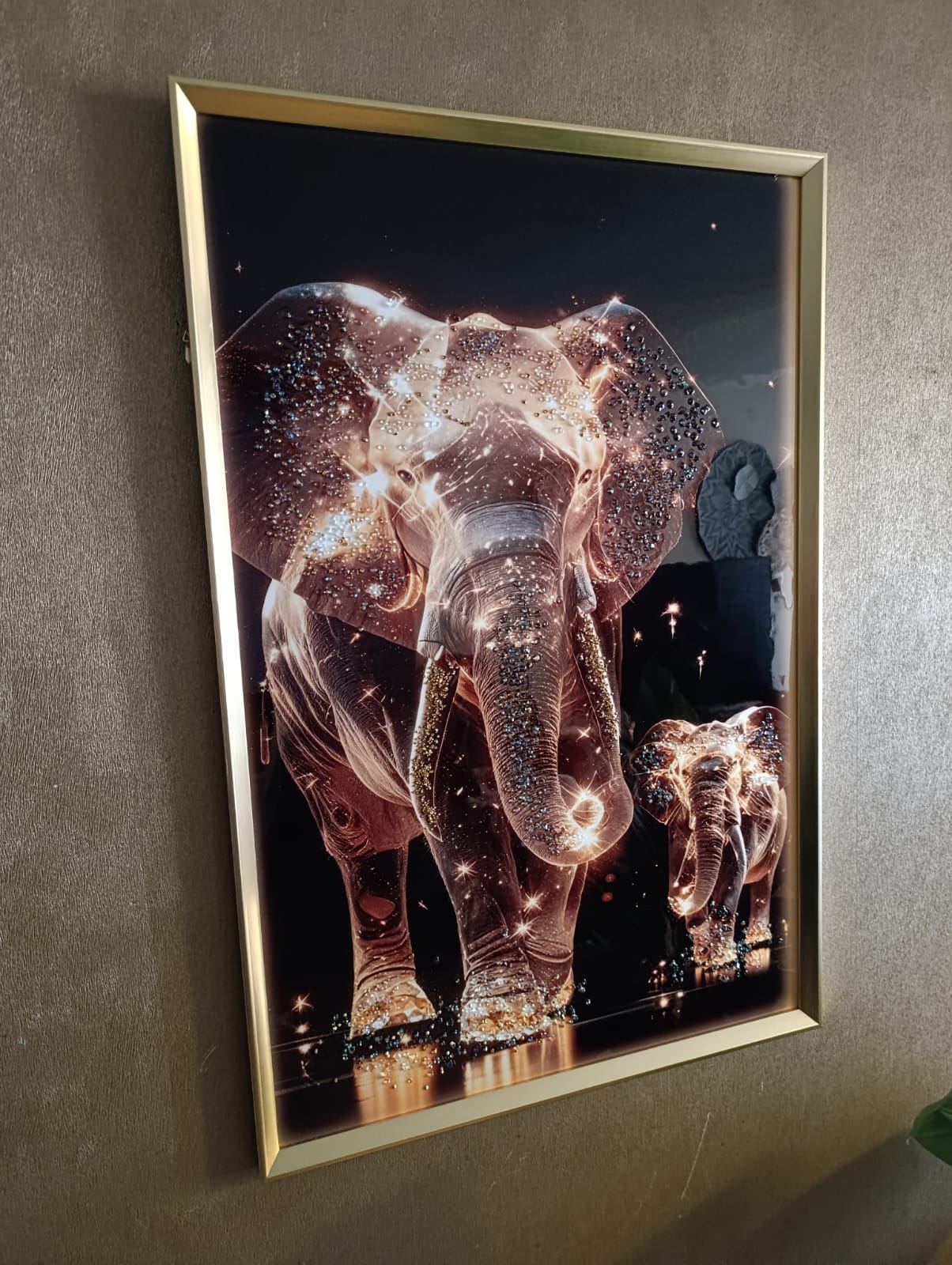 HERMOSO Y ELEGANTE CUADRO ELEFANTES DE LUZ, ESTILO DE PINTURA DIAMANTE 5D RELIEVE, MARCO DORADO, 91X61X3 CM, IDEAL PARA DECORAR DE FORMA ELEGENTE Y MODERNA CUALQUIER ESPACIO DE TU HOGAR.