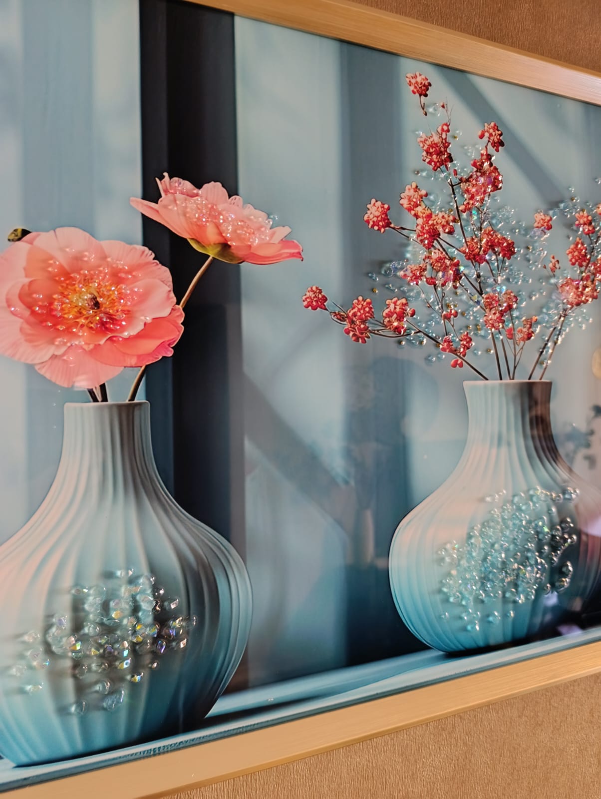 El marco de acrílico de 3 cm de espesor no solo realza la belleza de la pintura, sino que también garantiza durabilidad y un acabado elegante. La temática de macetas en colores vivos invita a la alegría y la creatividad, convirtiendo cualquier ambiente en un lugar acogedor y lleno de vida.