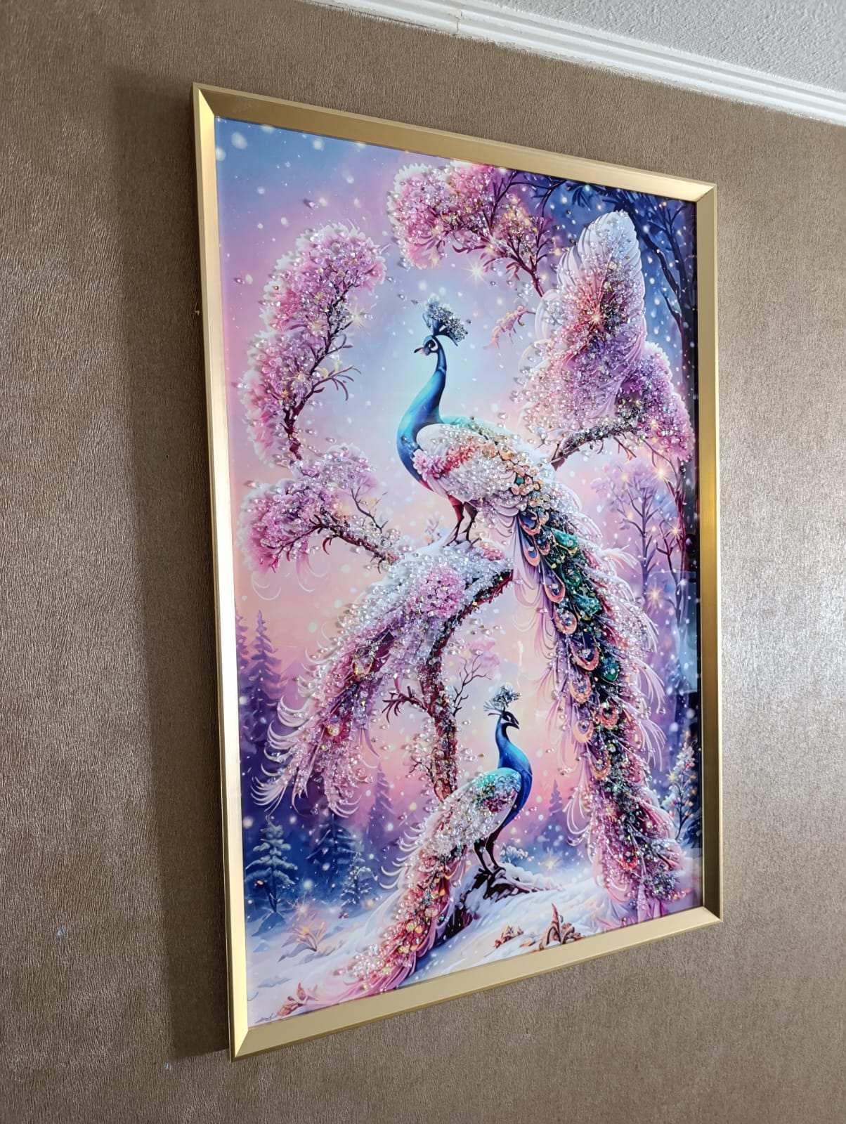 HERMOSO Y ELEGANTE CUADRO PAVOS REALES SNOW DIAMANTE, ESTILO DE PINTURA DIAMANTE 5D RELIEVE, MARCO DORADO, 91X61X3 CM, IDEAL PARA DECORAR DE FORMA ELEGENTE Y MODERNA CUALQUIER ESPACIO DE TU HOGAR.