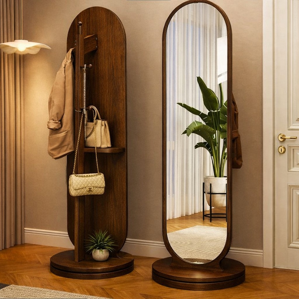 Descubre el Espejo Cuerpo Entero Giratorio con Perchero Color Nogal Oscuro, una pieza que combina funcionalidad y estilo moderno. Con unas dimensiones de 168 cm de altura y 30 cm de ancho, este espejo es ideal para cualquier espacio, ya sea en el dormitorio, el hall de entrada o el vestidor. Su diseño arqueado no solo aporta un toque estético, sino que también permite una visualización completa de tu atuendo.