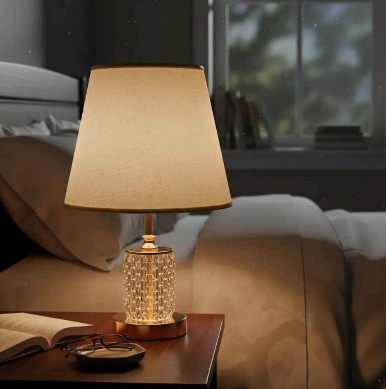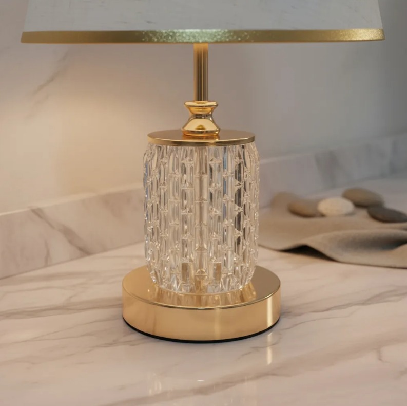 HERMOSA LAMPARA DE MESA, BASE DE METAL Y CUERPO DE ACRILICO TRANSPARENTE, ALTURA DE 43 CM, IDEAL PARA DORMITORIOS, ESQUINEROS O MESAS LATERALES.