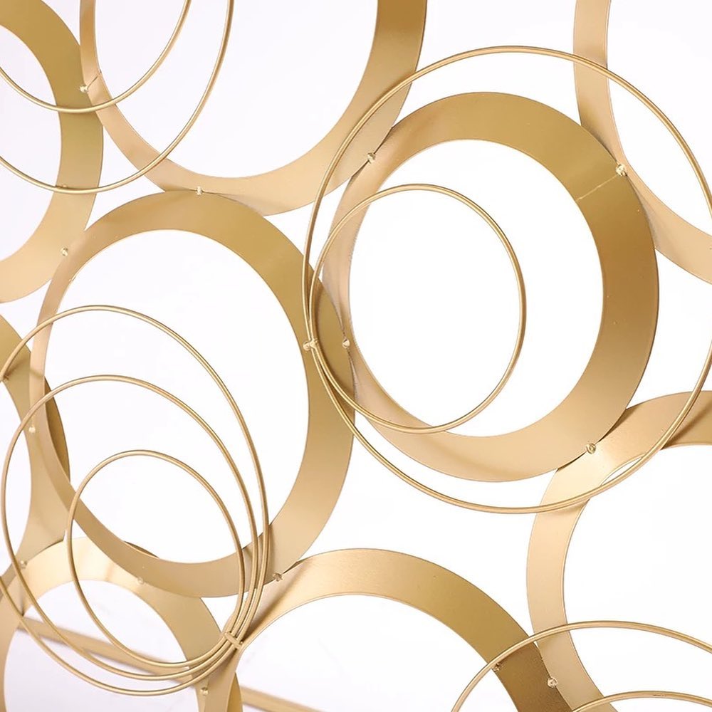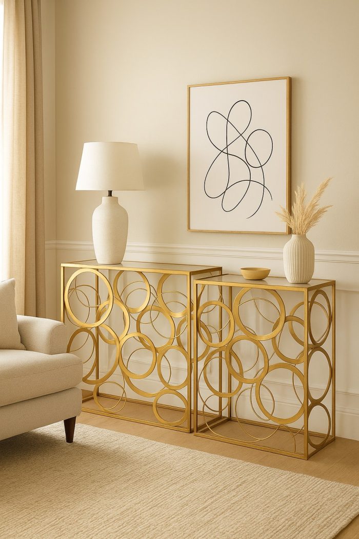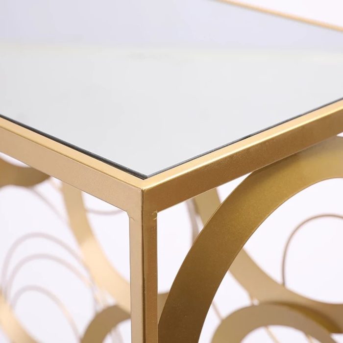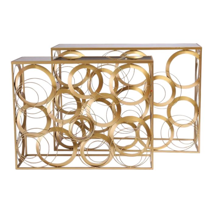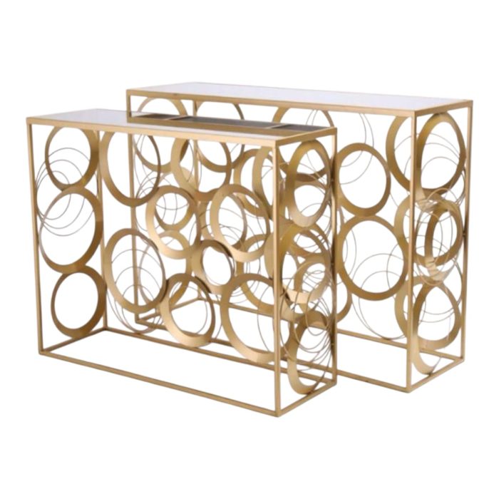 Par de mesas de consola con base de metal dorado y diseño de círculos entrelazados, con tapas de vidrio espejadas, que añaden un toque de estilo glamuroso y contemporáneo a cualquier entrada o sala de estar.