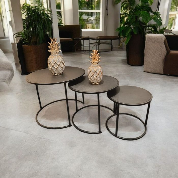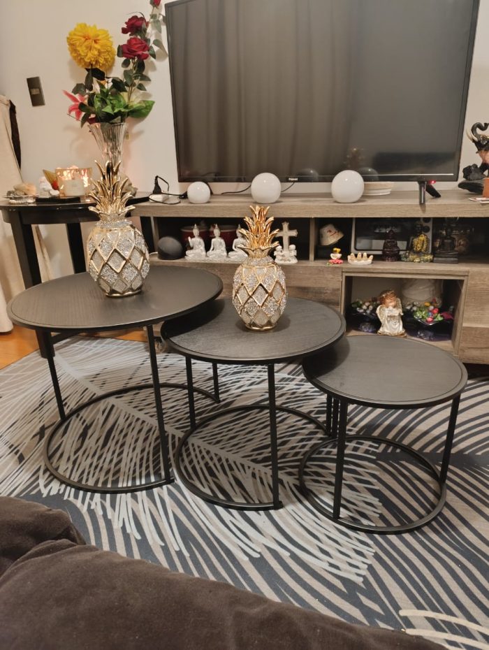 Las mesas son de calidad buena/resistente y tienen un aspecto moderno. Un hermoso conjunto que cabe en cualquier sala de estar y son fáciles de deslizar uno debajo del otro. Juego de 3 mesas (de centro) en 3 tamaños diferentes, embaladas en 1 caja.